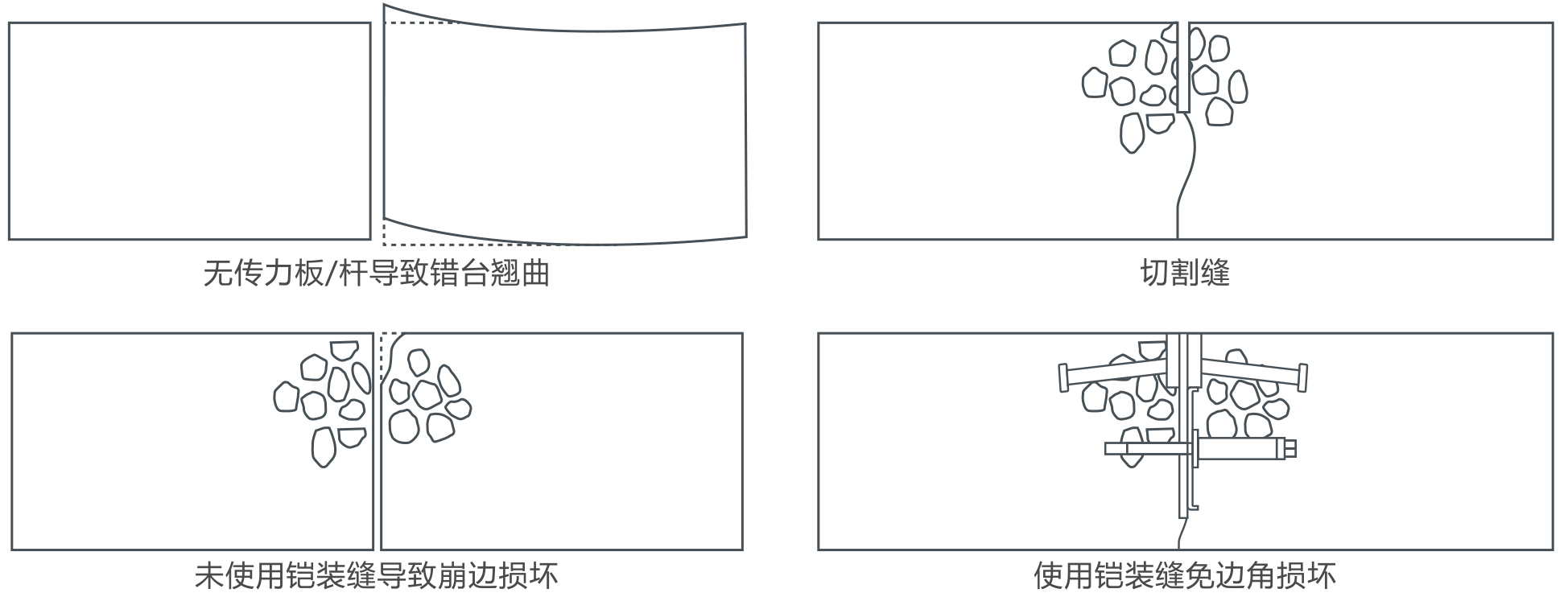 1 兩個板塊易發生錯臺、翹曲及崩邊等情況;2 施工縫張開后,由于震動密實導致骨料下沉,邊緣強度不夠容易崩邊損壞。